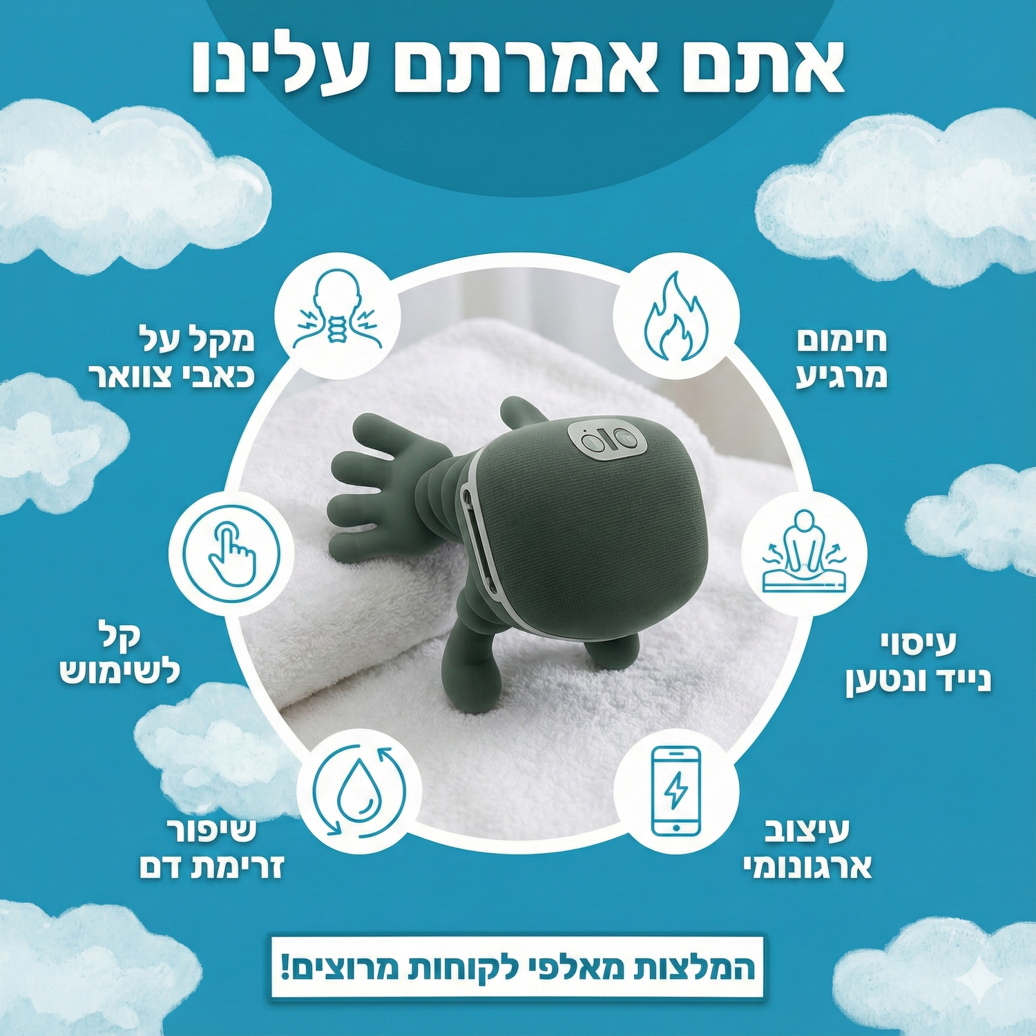נמאס לכם ממכשירים שרק "מרעידים" את העור ולא עושים כלום? המעסה שלנו נועד לדמות מסא'ז של ידיים אנושיות. הוא תופס את השריר, לש אותו, ולא מפספס אף נקודה.